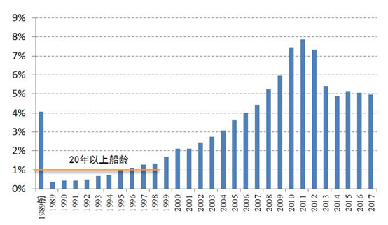 由于船舶建造周期长,从签订合同到完工交付通常需要3年左右,三年移动平均值可以反映新船需求的变动趋势。计算方法为:本年度调整后的新船订单量=(本年+上一年+前一年)新船订单量/3。经过处理后的数据显示,新船订单量于2012年一次探底,2017年二次探底,且2017年新船订单量已跌回本轮周期初期2003年的水平,大约7500万载重吨。综合考虑近三十年来的新船成交量水平、当前全球船队规模以及更新建造需求,可以判断,新船订单量已经触及本轮周期的谷底,未来几年,全球新船订单量的年平均水平也将大致维持在8000万载重吨左右。